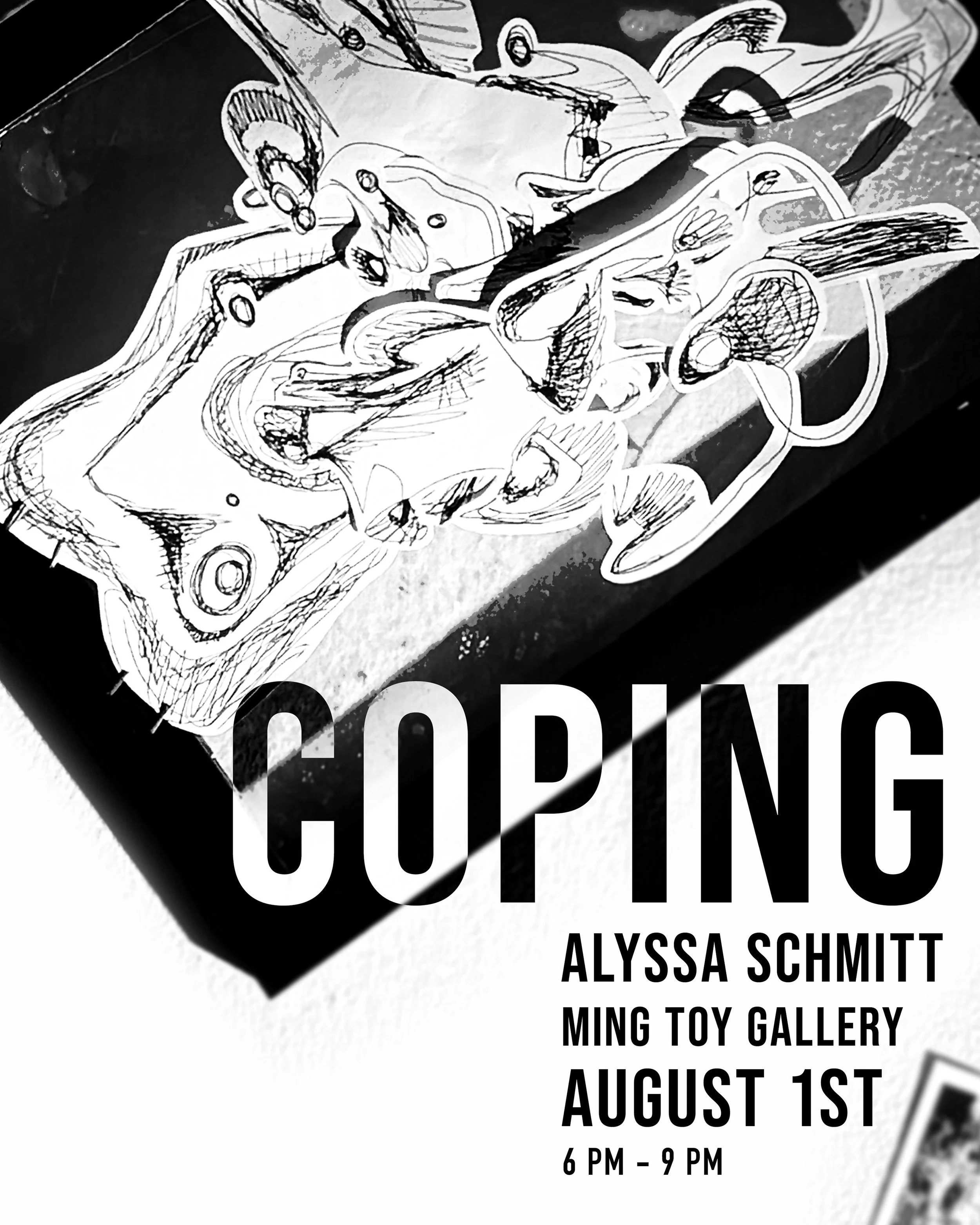 Featuring framed drawings and writings from Schmitt’s personal sketchbook, the show examines emotional turbulence, the myth of the tortured artist, and the aesthetics of release. Outside, the accompanying installation Cloud Gazing transforms the alleyway into a sheer, colorful canopy—inviting viewers into a fleeting moment of vibrant, defiant joy.